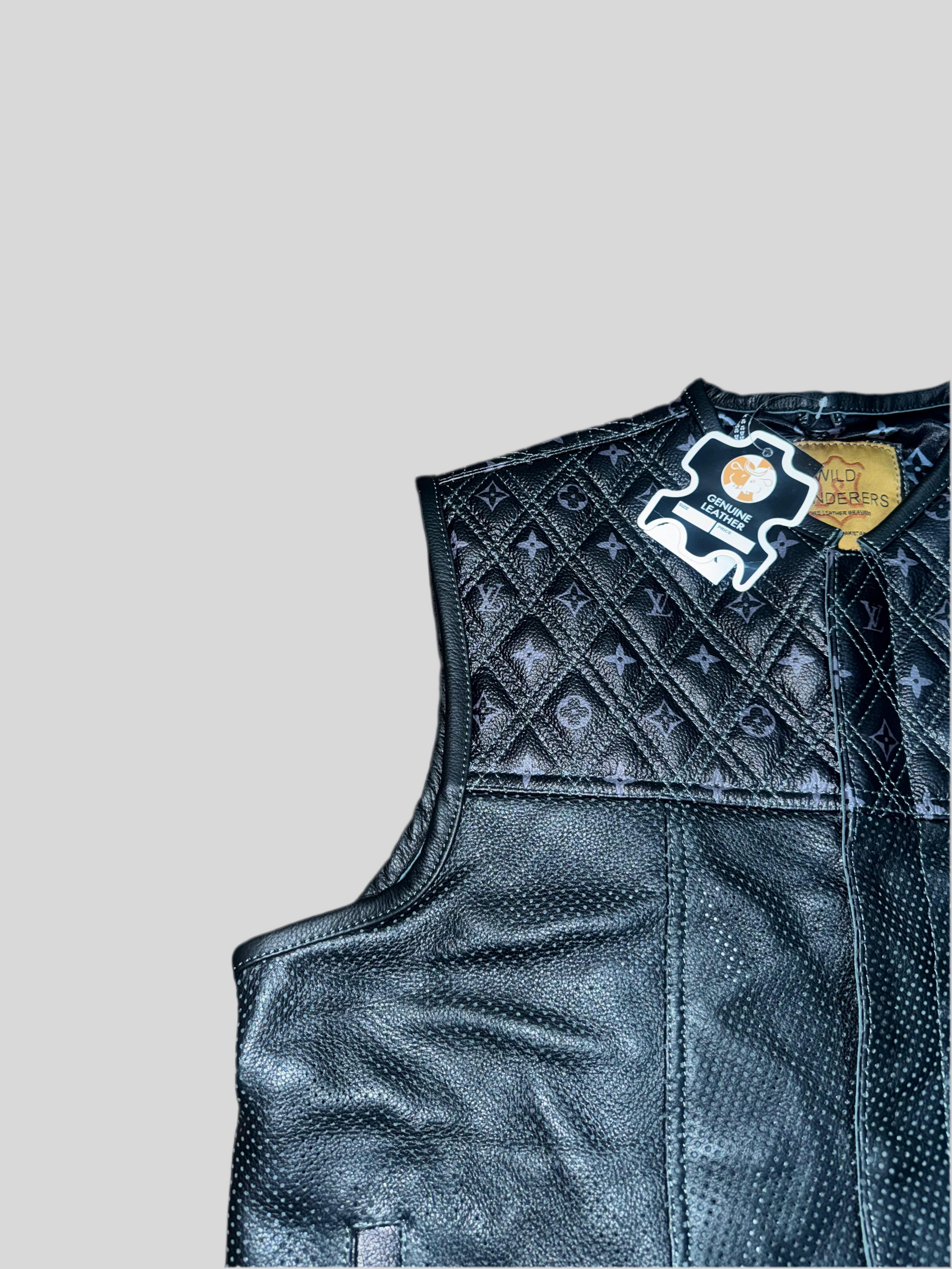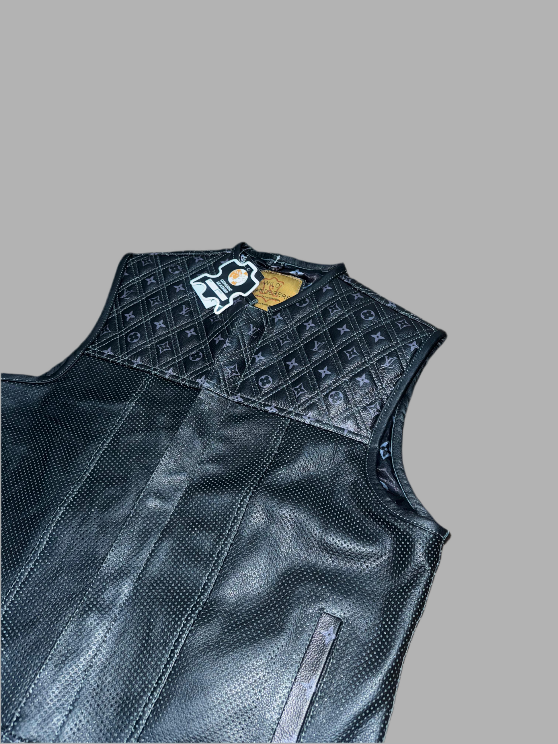 This durable and stylish branded perforated leather motorcycle vest is crafted with pure leather and expert craftsmanship. Stay comfortable and protected on your next ride with its superior quality and design.