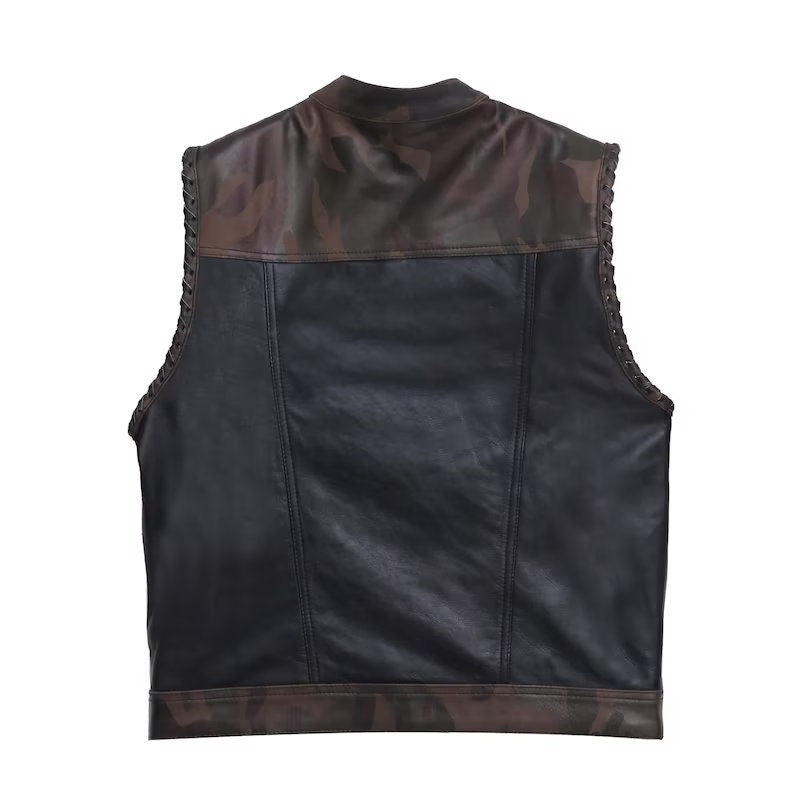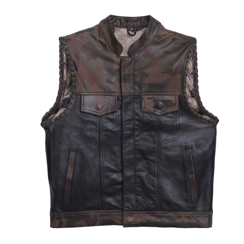 Unleash your biker spirit with the Camo Style Denim Leather Motorcycle Vest, a striking fusion of military-inspired camo, premium denim, and genuine leather. This braided-arm biker vest is crafted for riders who demand both style and durability. Whether you're cruising the open road or making a bold fashion statement, this unique club vest is designed to set you apart.