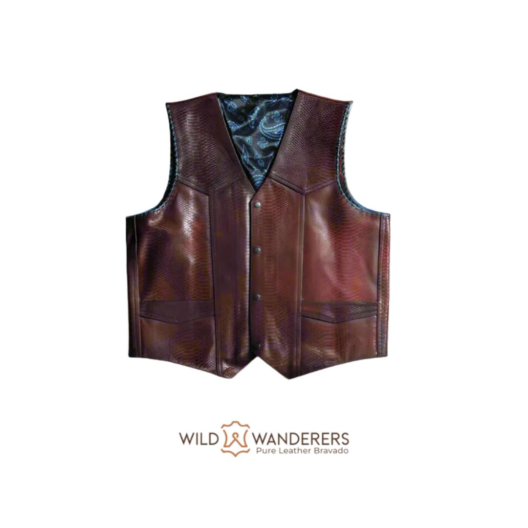 The Leather Vest Maroon Red Distress also boasts a classic western style with its intricate detailing and cowboy vest design. It's the perfect blend of classic and modern, making it suitable for any occasion, from a casual ride to a formal event.