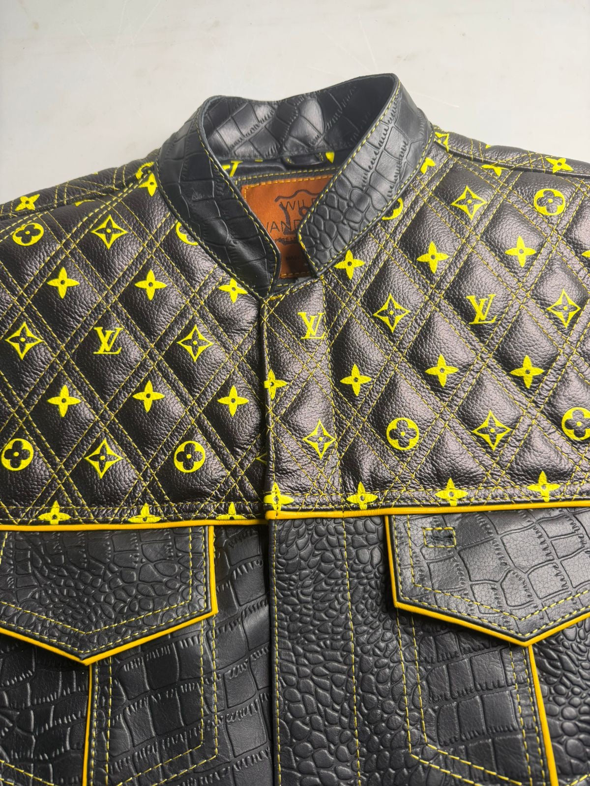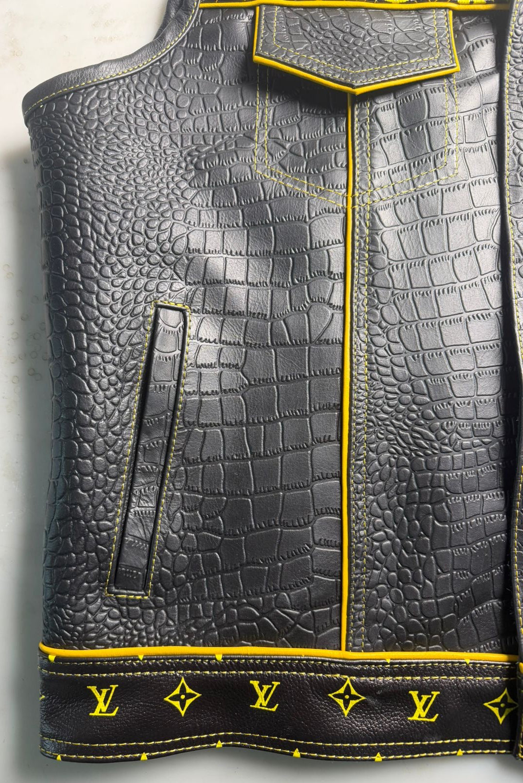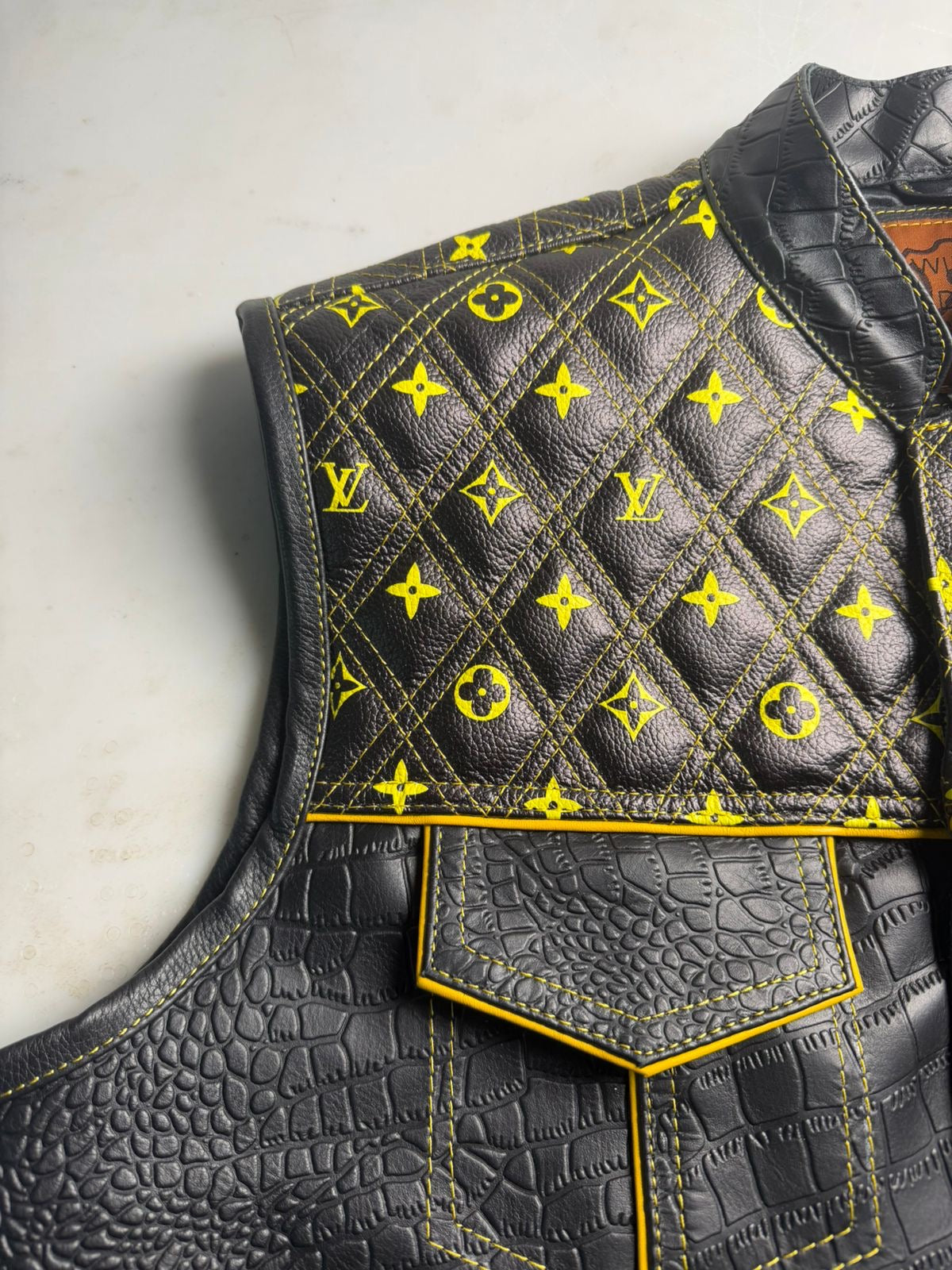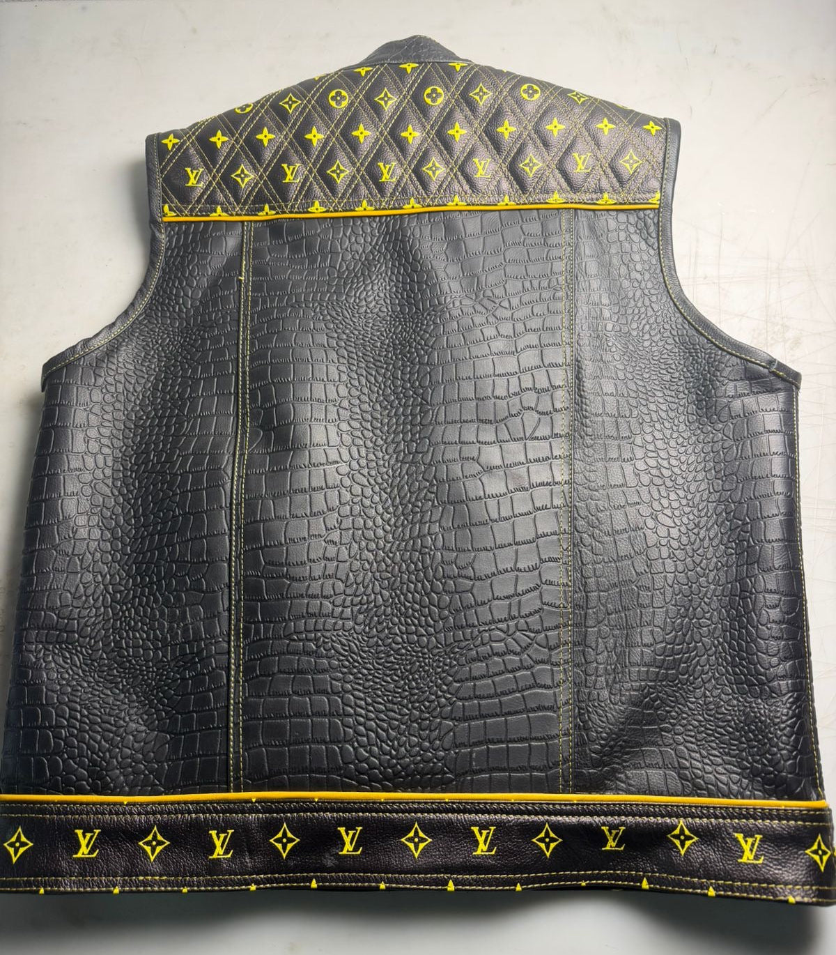 Ride in luxury with this bold biker vest—featuring diamond-quilted LV print on top and rugged crocodile/alligator leather below. Edgy, exclusive, and built for the road."