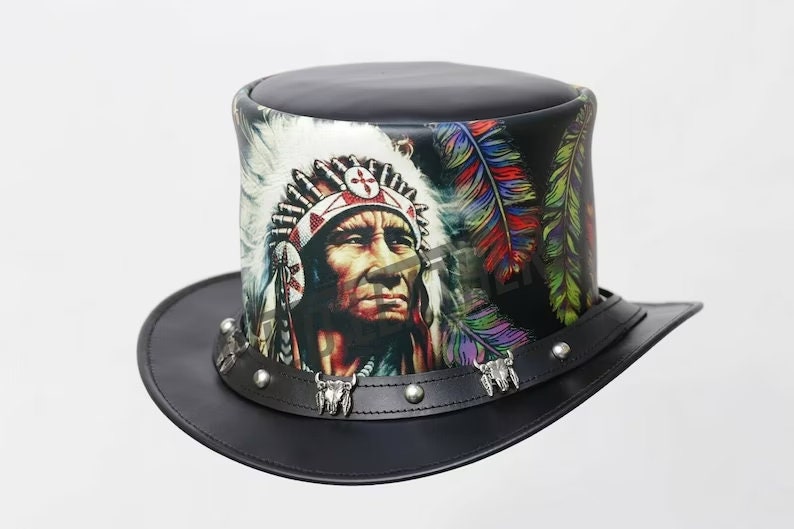 If you're a fan of Native American culture or just looking for a unique top hat, this Red Indian Feather Head Native American Leather Top Hat is the perfect accessory for you. Don't miss the chance to make a statement with this one-of-a-kind hat. Get yours now!