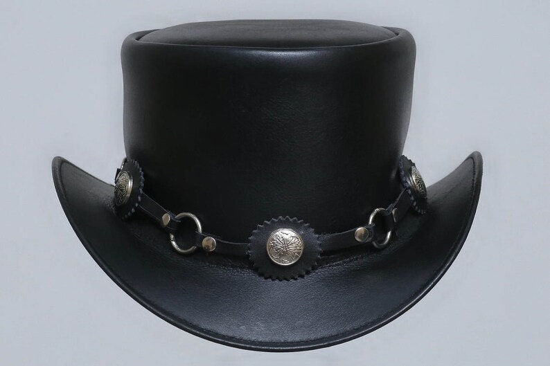 <p>Embark on a journey of style with the Steampunk El Dorado The Swagger Black Flower Concho Band Leather Top Hat. This extraordinary accessory captures the essence of steampunk fashion with a touch of wild west charm, creating a truly captivating and unique look.</p> <p>Crafted with high-quality leather, this top hat exudes a sense of rugged elegance. The standout feature is the black flower concho band, adorned with intricate details that add a touch of sophistication and allure.</p> <p>Features:</p> <p>Premium Leather: Crafted with top-quality leather, ensuring durability and a luxurious feel.<br> Steampunk Wild West Fusion: The combination of steampunk fashion and wild west aesthetics creates a truly distinctive and eye-catching look.<br> Black Flower Concho Band: The intricate flower concho band adds a touch of elegance and individuality to the hat.<br> Versatile Style: Perfect for steampunk enthusiasts, wild west lovers, and those seeking a statement-making accessory.<br> Unisex Appeal: Designed to suit both men and women, allowing everyone to embrace their unique style and express their individuality.<br> Let this hat be your symbol of confidence and adventure as you step into a world of steampunk wonders and wild west allure. With the Steampunk El Dorado The Swagger Black Flower Concho Band Leather Top Hat, you'll exude an air of mystery and charm, capturing the attention of all those around you.</p> <p>Tags: black flower concho band, leather, steampunk, wild west, top hat, versatile style, fashion-forward. Leather Top Hat, black leather Hat, Mens top Hats, Womens top Hats, Steampunk hat, Custom leather Hats, Vintage hats, Western leather hats, Cowboy hat, Handmade hat, Fashion hat, Gothic hat, Biker hat</p>