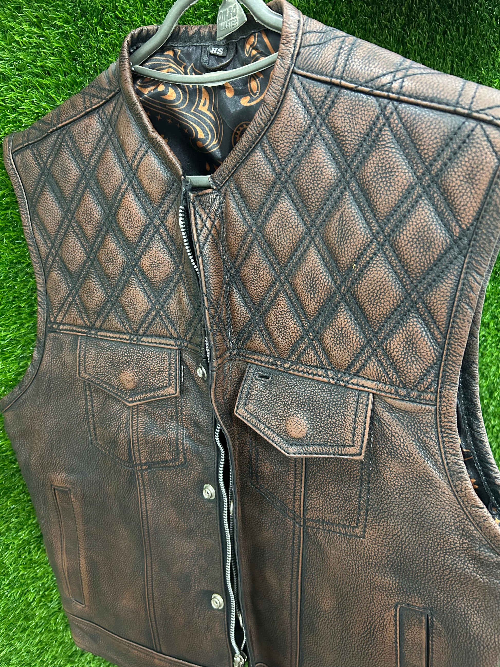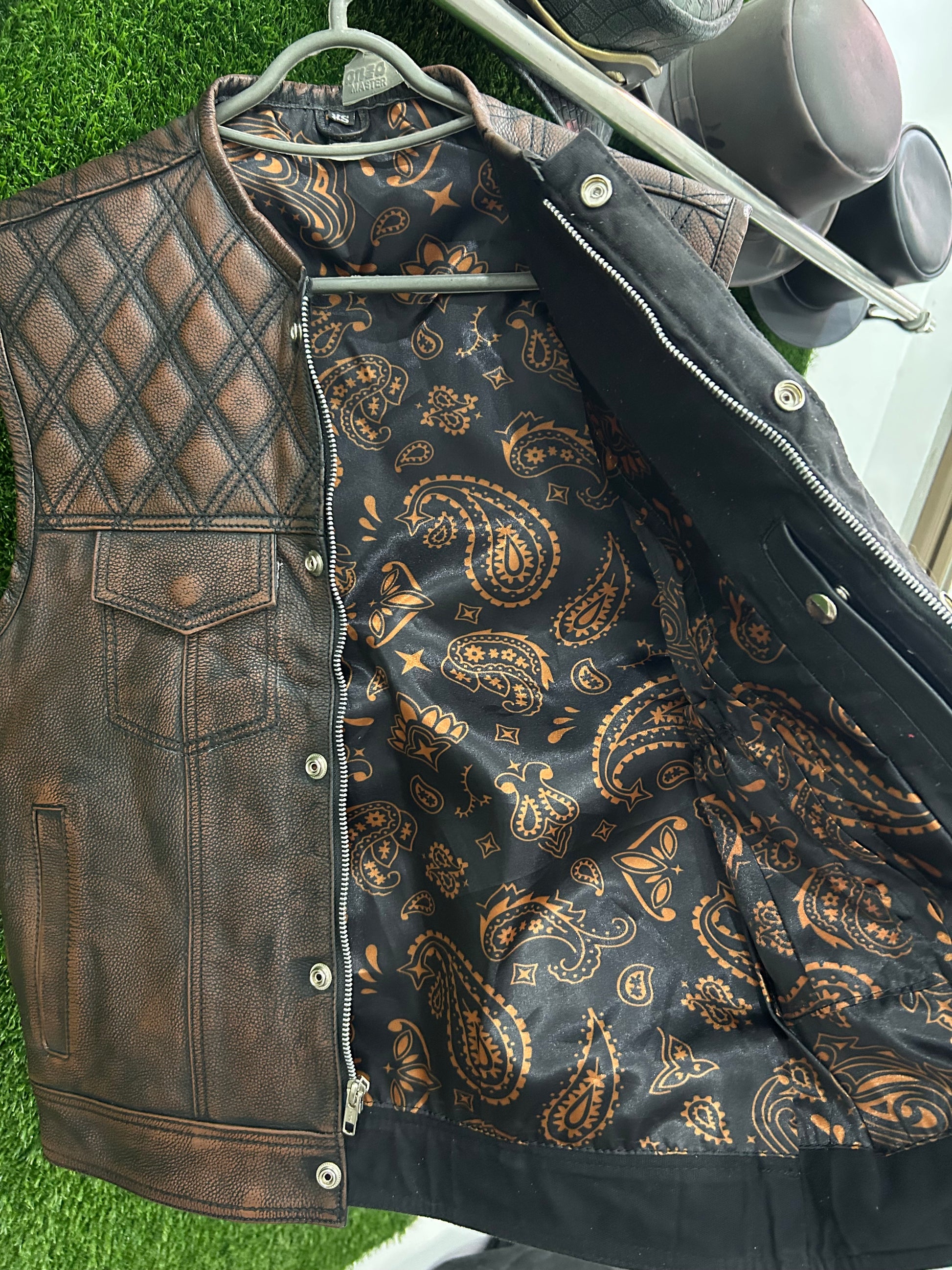 🔥 Crafted from premium whisky brown leather, this Limited Edition Vest is designed for riders who demand style, durability, and function. With double diamond contrast stitching and a custom brown & gold bandanna liner, this vest is built to stand out.