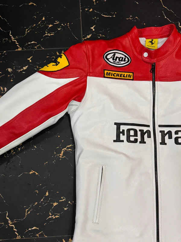 <p>Live the Scuderia Legacy</p> <p>Experience the pinnacle of motorsport heritage with the Wild Wanderers Ferrari Red &amp; White Racing Leather Jacket. Crafted from 100% genuine leather and featuring exclusive Arai and Michelin embroidery, this collector's edition jacket brings authentic racing pedigree to your streetwear wardrobe. Feel the passion of Italian engineering excellence in every stitch.</p> <p>Premium Features:</p> <p>· 100% genuine leather construction for superior quality and durability<br>· Iconic Ferrari Rosso Corsa red and white racing color scheme<br>· Exclusive Arai and Michelin embroidered sponsor logos<br>· Classic racing jacket silhouette with modern comfort fit<br>· Precision embroidery and professional stitching throughout<br>· Smooth heavy-duty zipper with Ferrari-inspired pull<br>· Rib-knit cuffs and waistband for secure, comfortable fit<br>· Multiple functional pockets with secure closures</p> <p>Racing Heritage Meets Modern Craftsmanship<br>This collector's edition jacket celebrates Ferrari's legendary partnerships with iconic brands Arai and Michelin. Each embroidered logo represents a piece of racing history, while the premium genuine leather ensures lasting comfort and style. The vibrant red and white colorway stays true to Ferrari's racing identity, making this the ultimate statement piece for serious collectors and motorsport enthusiasts.</p> <p>The Ultimate Jacket For:</p> <p>· Ferrari racing collectors and enthusiasts<br>· Motorsport memorabilia collectors<br>· Streetwear fashion with racing heritage<br>· Car meets and racing events<br>· Special occasions and statement dressing<br>· Investment-piece outerwear</p> <p>Care Instructions:</p> <p>· Professional leather cleaning recommended<br>· Store in cool, dry place away from direct sunlight<br>· Use wide hangers to maintain shoulder shape<br>· Avoid contact with harsh chemicals or abrasives</p> <p> Ferrari Racing Jacket, Genuine Leather Jacket, Red White Ferrari Jacket, Arai Michelin Edition, Ferrari Collector Jacket, Motorsport Leather Jacket, Racing Sponsor Jacket, Ferrari Embroidered Jacket, 100% Genuine Leather, Ferrari Memorabilia, Racing Fashion, Limited Edition Jacket, Wild Wanderers</p> <p>Wild Wanderers - Gear for the Unruly Spirit</p> <p>Authentic Racing Design • Collector's Edition • Limited Availability</p>