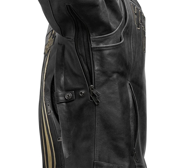 WW Harley Davidson Mens Black Leather Cafe Racer Jacket Vintage Motorcycle Jacket with Gold Stripes and Quilted Accents