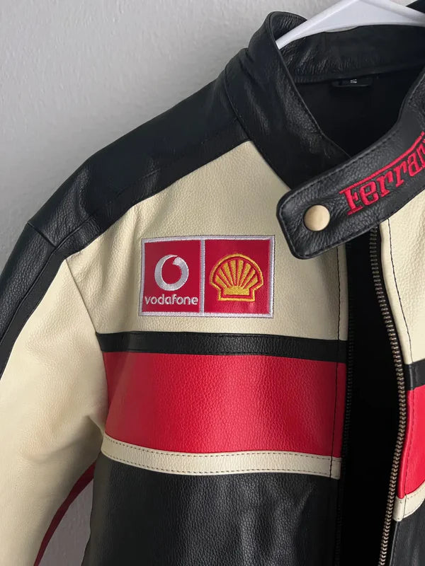 WW Premium Leather Ferrari F1 Racing Jacket Black Cream Red Vodafone Shell Sponsors